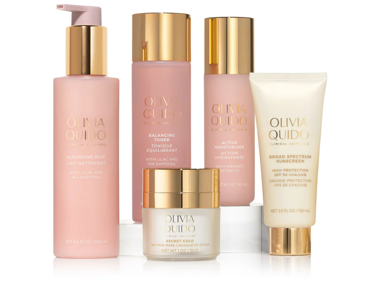 Our Beauty Queen Skincare Kit includes Olivia’s Essential Cleanser, Toner, and Moisturizer, and two Olivia Quido spa headbands perfect for washing off make-up and resetting skin before and after an event.